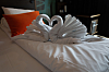 Hun smiler og peker på sengen foran oss. Samtidig som hun forteller om hverdagen sin på hotellet har hun skapt to håndklesvaner som vil ønske gjestene velkommen.