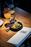Menyen besto av torsk med miso, kål, kreps, agurkesalat og tysk Riesling.